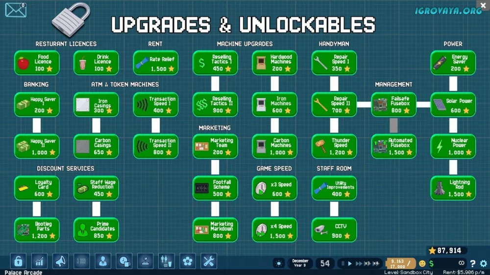 - Управляйте залом с аркадными игровыми автоматами, принимайте решения и развивайтесь;