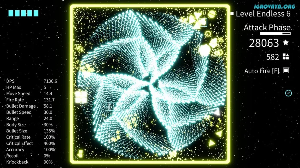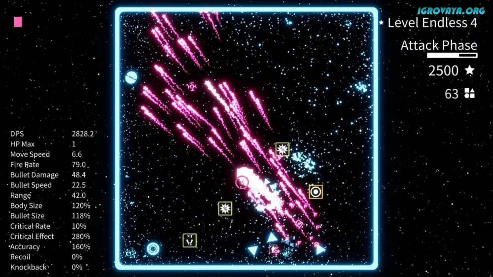 Вы будете управлять обычной геометрической фигурой, которую можно настроить и совершенствовать. Создайте своего уникального истребителя с помощью редактора, дополните его оружием и примочками, чтобы стать непобедимым.