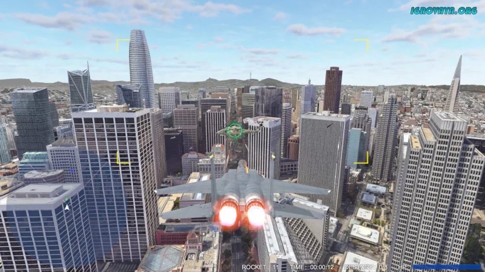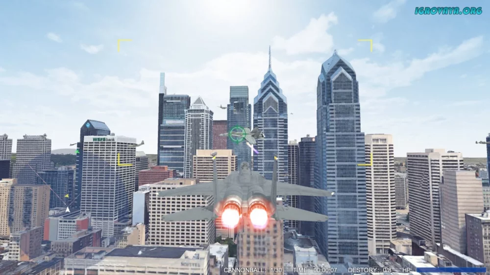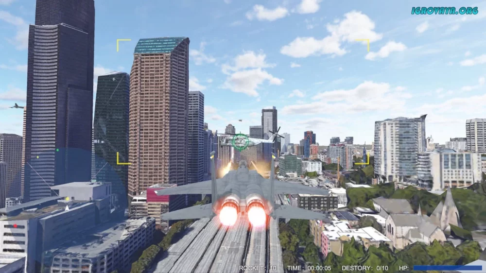 City Air Battle - захватывающая авиационная гоночная игра с элементами экшена, где вам предстоит пилотировать истребитель и принять участие в безумных гонках в городской среде.