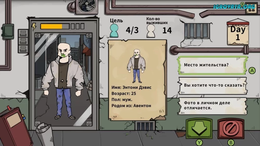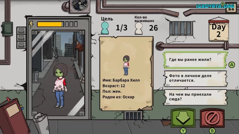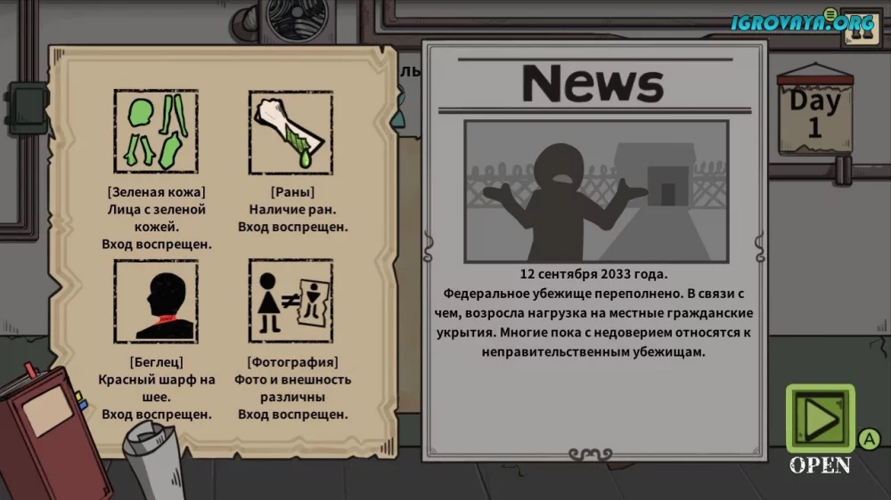Перед тем как вступить в должность, игроку предлагается ознакомиться с методическими указаниями. Они подробно описывают симптомы заражения - не только зеленая кожа, но и множество других признаков. Фотографии зараженных отображаются рядом с входной дверью, чтобы помочь вам в определении состояния прибывших. Задавайте участникам важные вопросы, чтобы узнать их психологическое и физическое состояние. Выбор необходимо делать взвешенно, ведь от этого зависит судьба вашего убежища и, возможно, всего человечества.