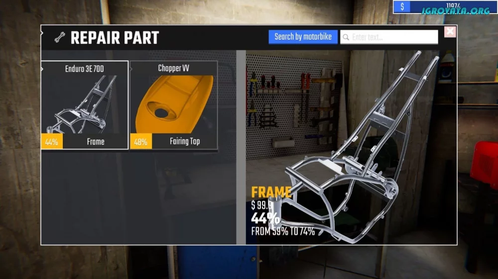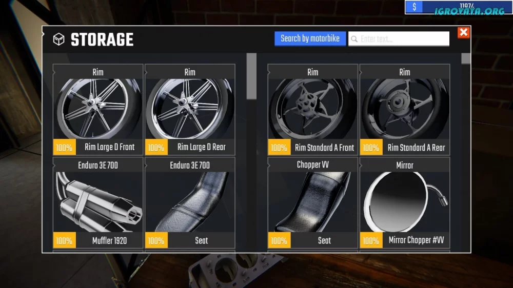 Начните свой путь с небольшой автомастерской в собственном гараже. Постепенно привлекайте клиентов, ремонтируйте их мотоциклы, зарабатывайте репутацию и развивайтесь. С каждым новым заказом ваша мастерская будет расти, а вы сможете оборудовать её всем необходимым оборудованием.