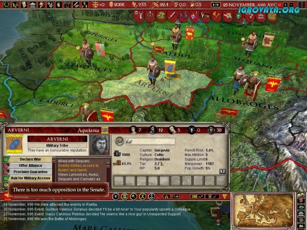 - Карта игры охватывает часть Европы, Переднюю Азию и Северную Африку, где встречаются варвары, управляемые искусственным интеллектом. Они могут атаковать ваши провинции и основывать свои государства. Будьте готовы к защите своих границ и укреплению армии.