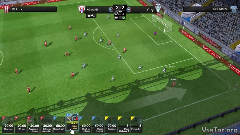 - Управляйте командой в реальном времени на футбольном поле во время матча, выдавайте тактические указания и следите за результатом.