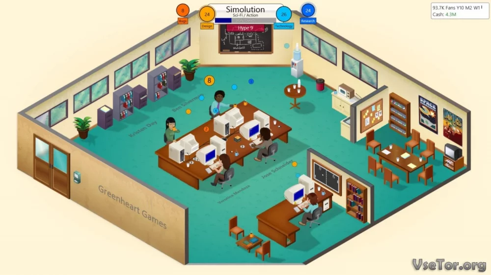 Постепенно, разрабатывая и продавая несколько игр, вы сможете переехать в офис и приступить к более крупным проектам. Наймите специалистов, разделите обязанности и стремитесь к тому, чтобы ваш бизнес приносил прибыль. Исследуйте новые технологии, открывайте лабораторию и уделяйте особое внимание созданию качественных игр.