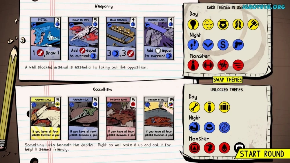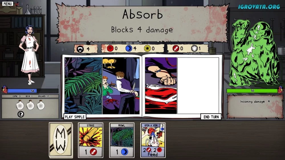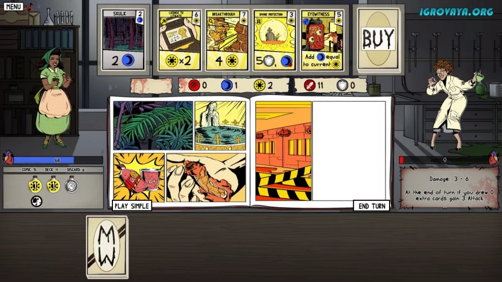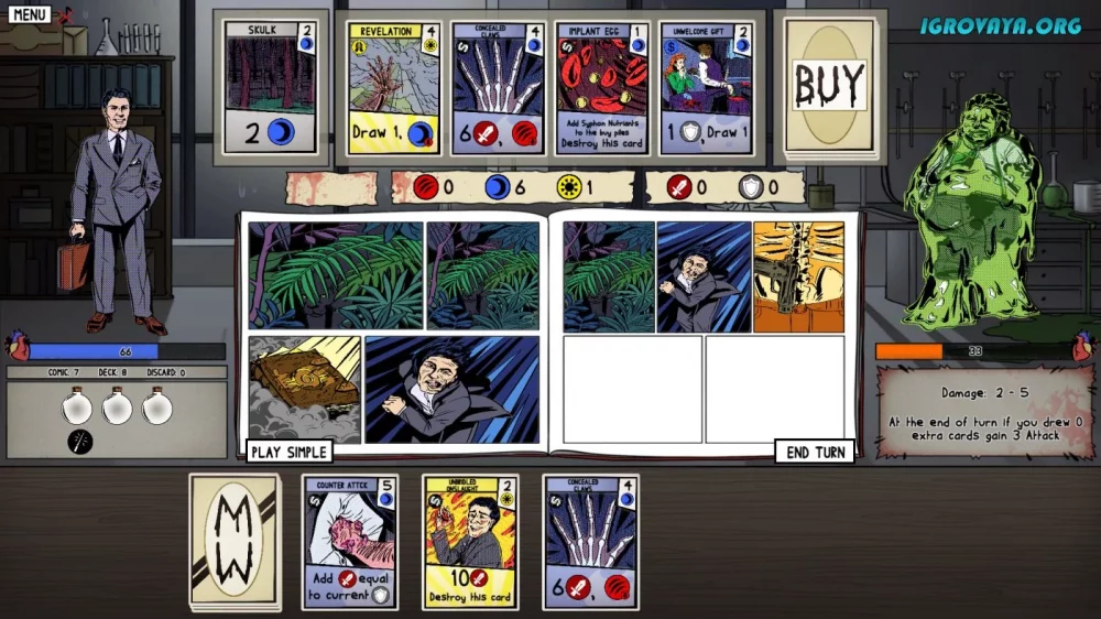 - Следите за шкалой здоровья - при ее уменьшении ваша скрытая сущность начнет выходить наружу, меняя карты в вашей колоде.
