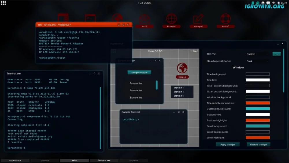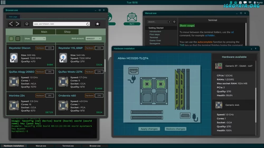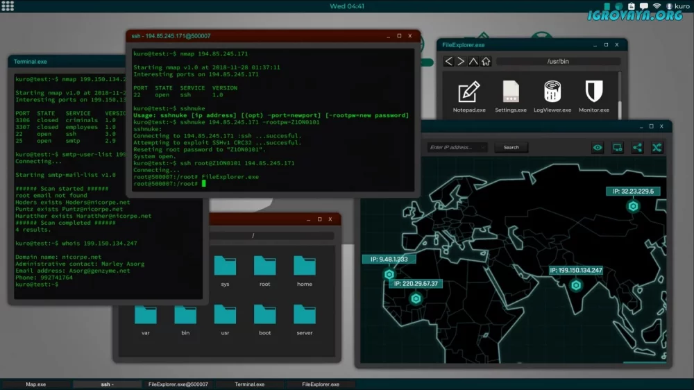 - Простой геймплей с экраном терминала, утилитами и программами;