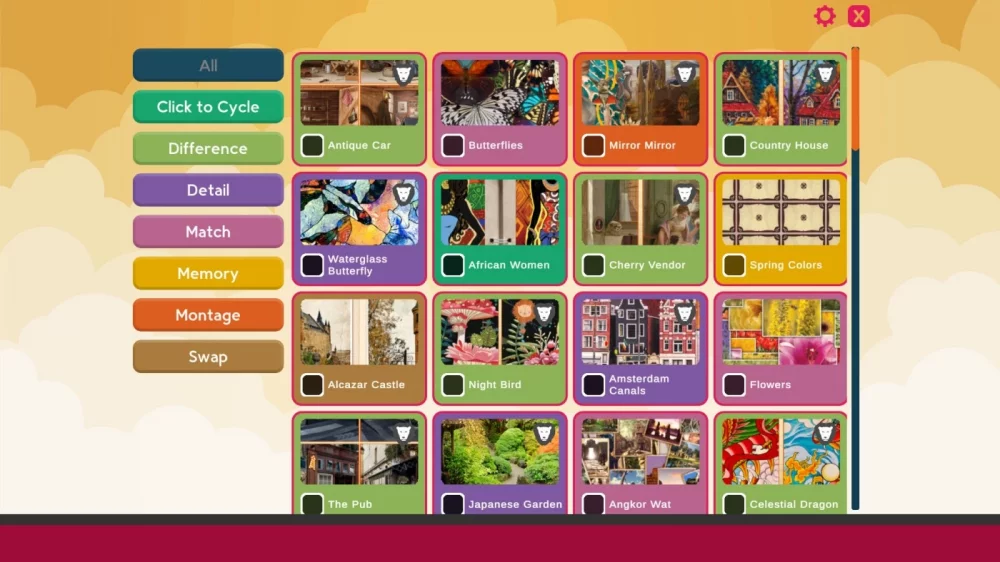 Погрузитесь в увлекательный мир разнообразных уровней семи видов игр, каждый из которых имеет десятки тематических заданий с прогрессирующей сложностью. Находите отличия, ищите совпадения, тренируйте память и решайте сложные головоломки, наслаждаясь разнообразием игрового процесса.