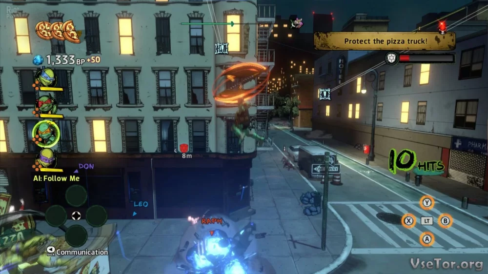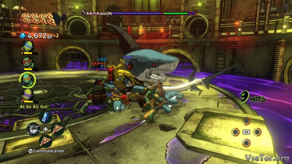- Возможность переключаться между черепашками в любой момент игры, придавая прохождению миссий дополнительную динамику и интерес.