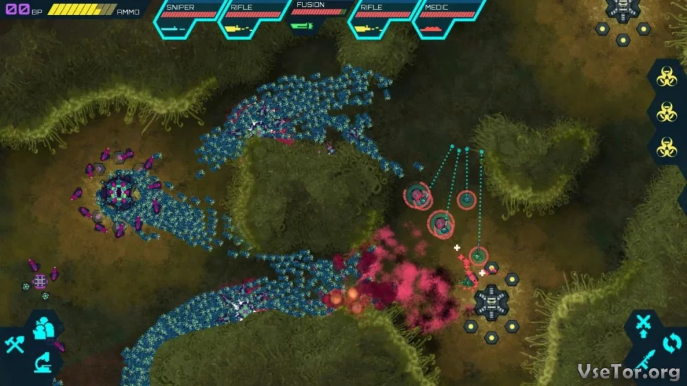 Ваш отряд состоит из пятерых смельчаков, каждый со своими уникальными навыками. Вам предстоит защищать базу, укреплять оборону, создавать башни и атаковать врага. Битвы становятся настоящей эпопеей, когда солдатам противостоят армии инопланетян, постоянно адаптирующиеся к вашим действиям.