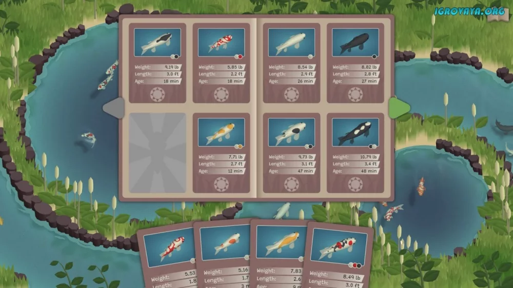 - Открывайте новые водоемы и разводите различные виды кои, создавая уникальные комбинации.