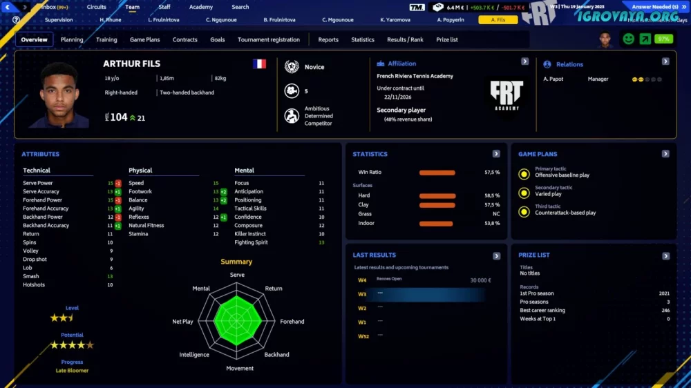 Примите вызов и покажите свое мастерство на корте, ведя свою команду к победе. Tennis Manager 2023 предлагает уникальный игровой опыт, где ваша стратегия и умение принимать решения будут определять результаты. Готовы ли вы стать лучшим менеджером и привести своих теннисистов к славе и успеху?