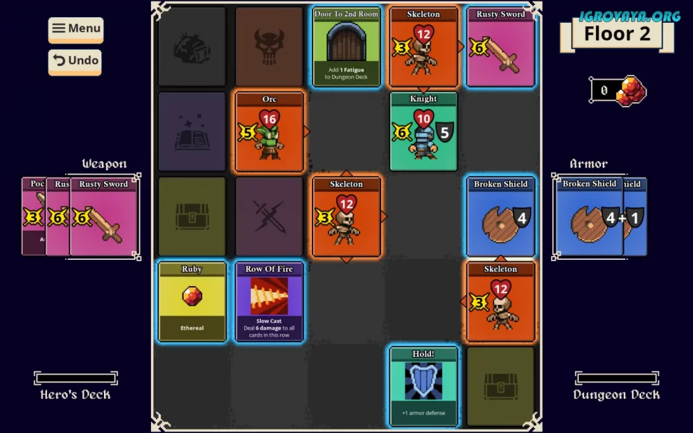 - Путешествие по полю, открывая по одной карте за раз, и принимая стратегические решения о том, как использовать найденные предметы или сразиться с врагами.