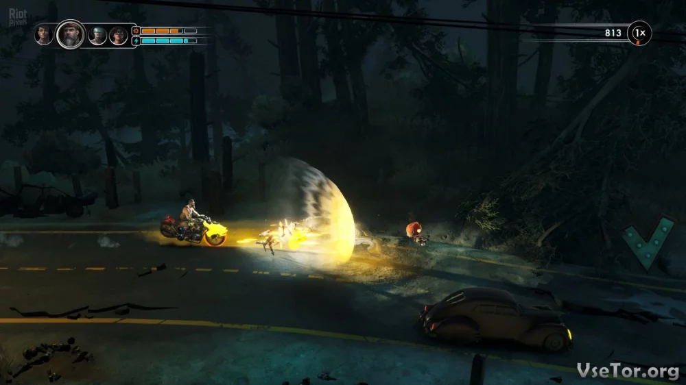 Так вот, главный сюжет заключается в нападении роботов-пришельцев на планету. Никто не может противостоять им, кроме одной банды отчаянных байкеров. Эти три смельчака встали на защиту человечества и начали уничтожать врагов. Игрок может выбрать одного из героев и присоединиться к ним в их борьбе. Будь то глава банды с уникальными циркуляционными пилами вместо колес, инженер-технолог с умными гаджетами и роботами, байкерша-пиромант или парень-цепеплет, каждый персонаж предлагает свой стиль игры и свои способности.