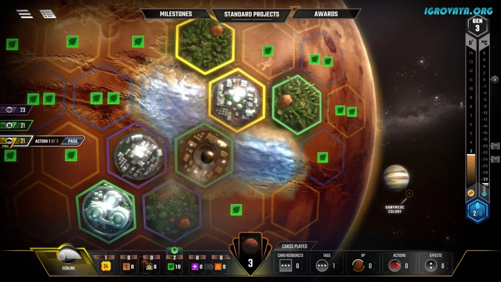 Основной упор в Terraforming Mars делается не на создание комфортной базы для людей, а на процесс терраформирования. Вы будете изменять атмосферу, растапливать ледники, выращивать леса, осуществлять городские строительства и расширять производственные мощности. Ваша задача – изменить всю планету целиком.