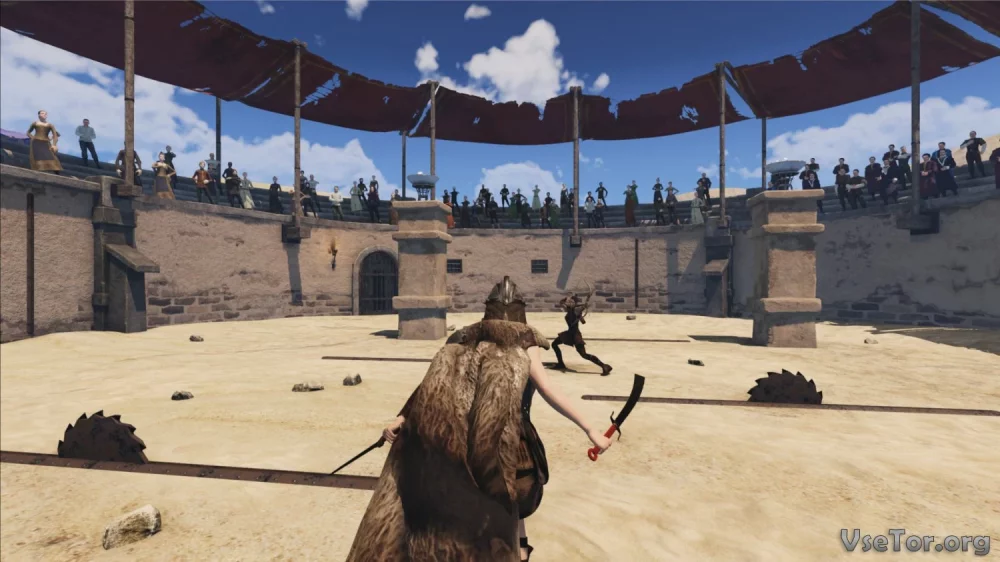 - Увлекательный сюжет на территории вымышленных Вольных земель, где вас ждут разнообразные города с аренами и постоянными сражениями.