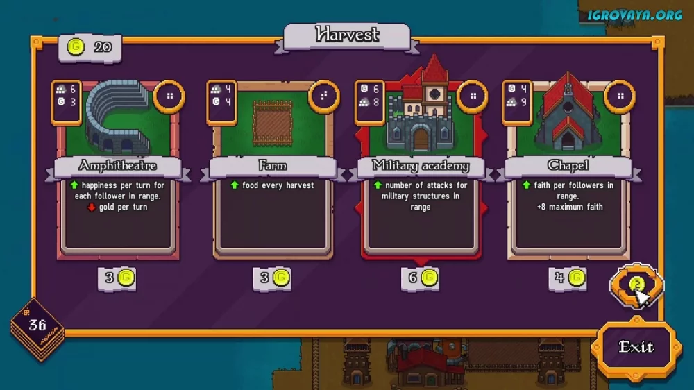 - Возможность выбора различных зданий с уникальными улучшениями.