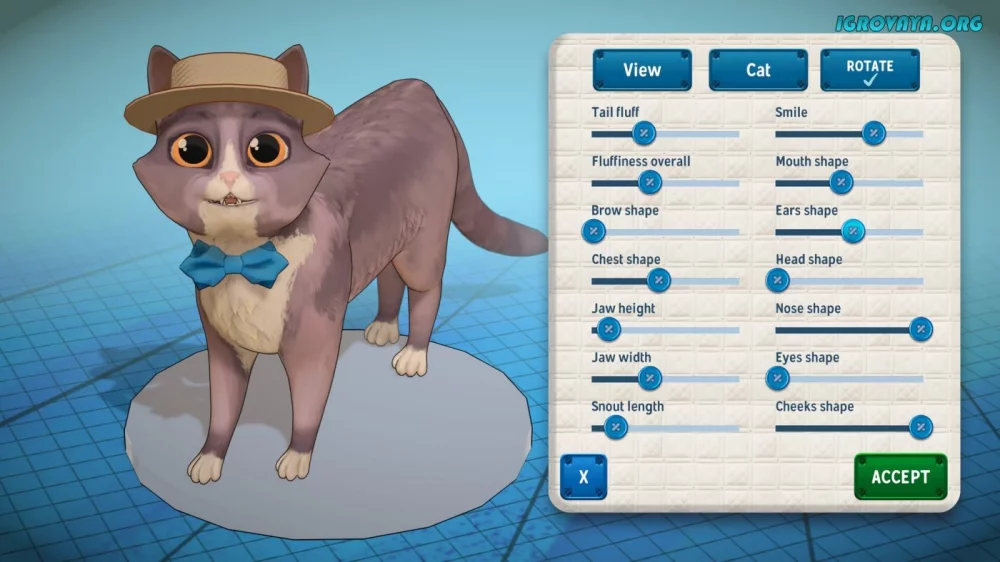 - Возможность создавать собственных котиков, выбирая их параметры и наряжая их в различные костюмы.