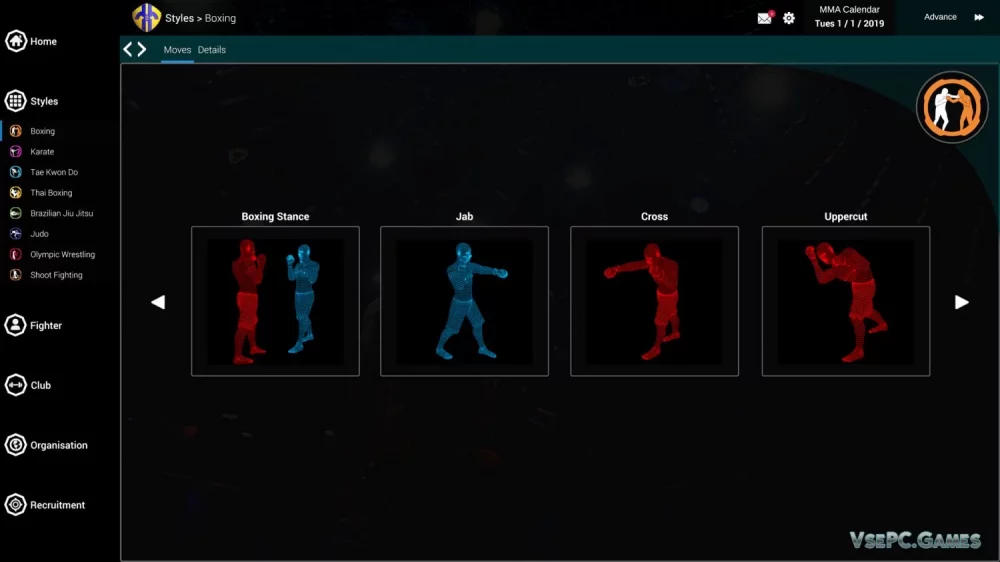 Кроме того, вас ждут разнообразные состязания, а также возможность расширить свою команду, нанять тренеров и медицинский персонал, и развивать молодых бойцов из юниорской лиги. Вся эта работа позволит вам не только добиться успеха в спорте, но и создать сильный и уважаемый клуб.