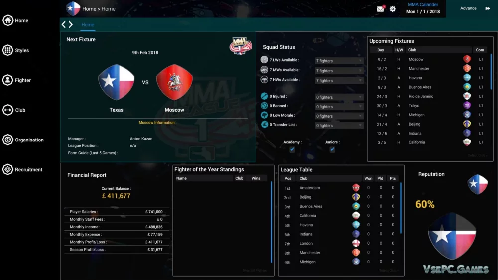 - Контроль над реальным клубом и командой бойцов MMA.