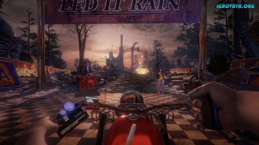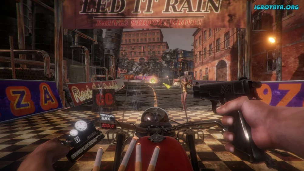 Встречайте игру, которая сразу и гоночная аркада, и боевик, и шутер от первого лица, и хоррор - Led It Rain. Здесь вас ждут безумные гонки на мотоциклах, зомби и многое-многое другое...