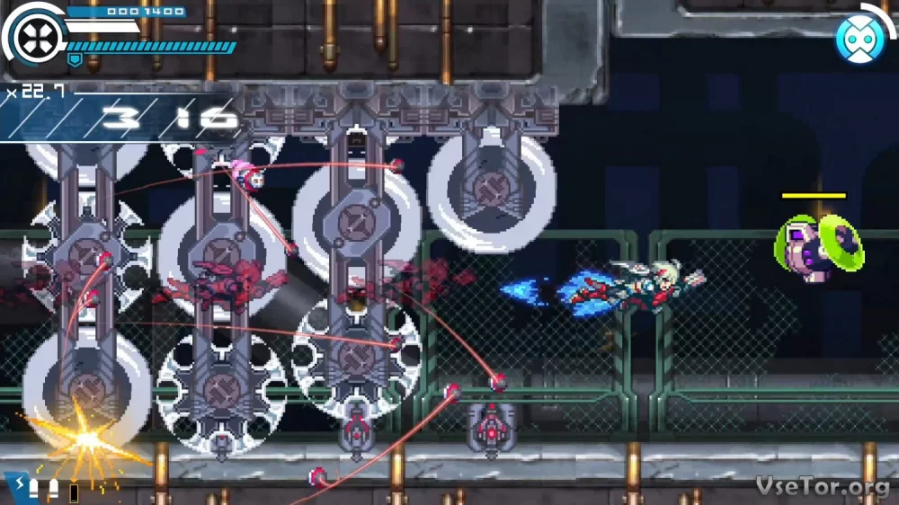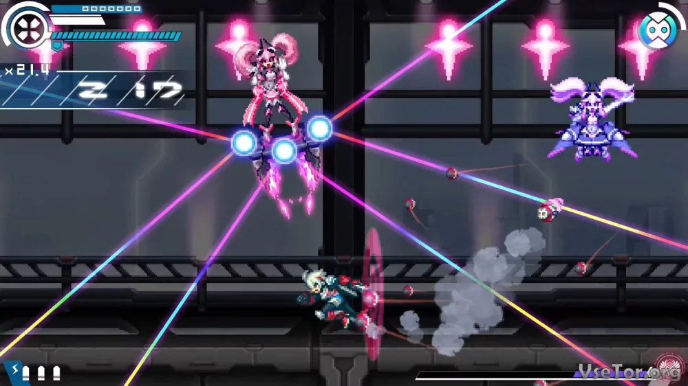 Gunvolt Chronicles: Luminous Avenger iX также радует необычным сюжетом, отличной озвучкой и разнообразием уровней и врагов. Каждая локация наполнена яркими цветами и впечатляющими спецэффектами, что погружает вас в захватывающий игровой мир.