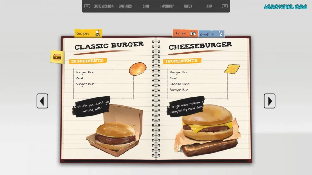 - Готовка: изучайте рецепты, придумывайте уникальные блюда, удивляйте посетителей и увеличивайте свою прибыль.