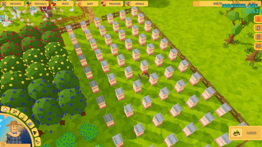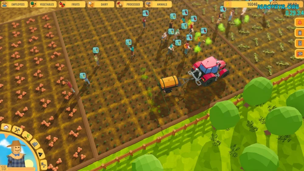 Погрузитесь в атмосферу фермерской жизни, возделывайте урожаи и разводите животных, чтобы увеличить прибыль вашего хозяйства. В игре есть широкий выбор культур для посадки, таких как лук, салат, кукуруза, картофель, помидоры, пшеница, яблоки, свекла, морковь и многое другое. Выбирайте наиболее подходящих работников для работы на вашей ферме, чтобы обеспечить ее процветание и развитие.