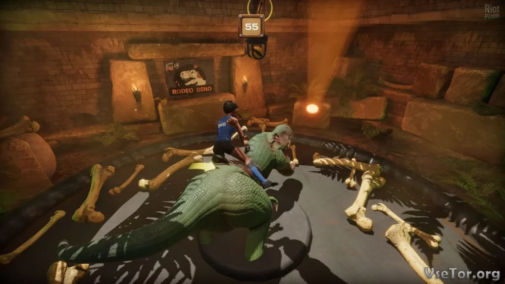 - 12 разнообразных испытаний, включая родео на динозаврах и гонки на погрузчиках.